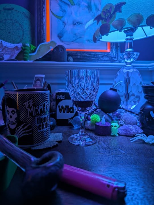 A little glass of pomegranate juice for the antioxidants and the tingle on my tongue. A little smoke to bewitch my mind. Black light. Intense mode. Doodads like a crow.