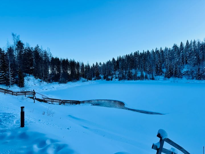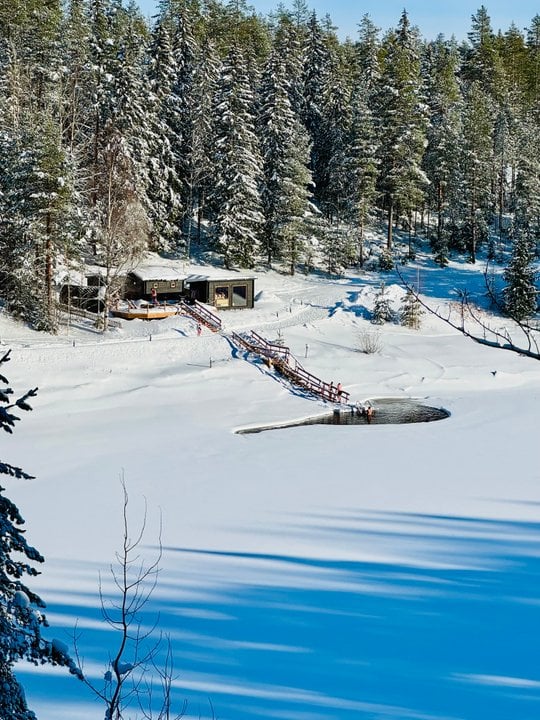 A short trek in the snow filled forests with views of the frozen lake and sauna