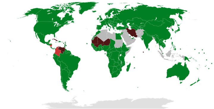 green - Countries that recognize Israel green/brown - States/territories whose recognition of Israel is disputed brown - Countries that have withdrawn their recognition of Israel red- Countries that have suspended or cut bilateral ties with Israel, but maintain recognition gray - Countries that have never recognized Israel