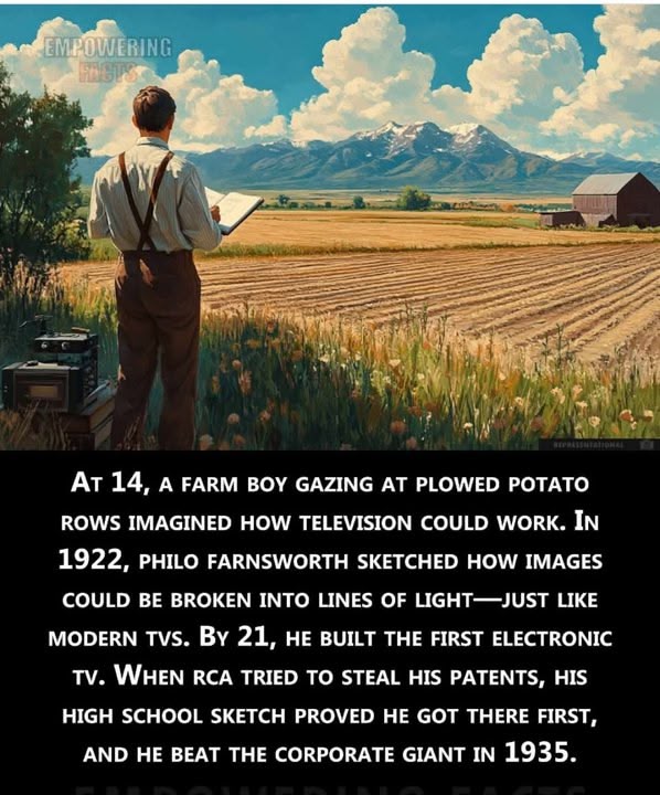 By 21, Farnsworth built the first fully functional electronic television. When RCA, the biggest name in radio and technology, tried to steal credit for his invention, Farnsworth’s high school teacher brought out his original sketch as proof. In 1935, the young inventor defeated the corporate giant, securing his place as the true father of television. 📺🚜