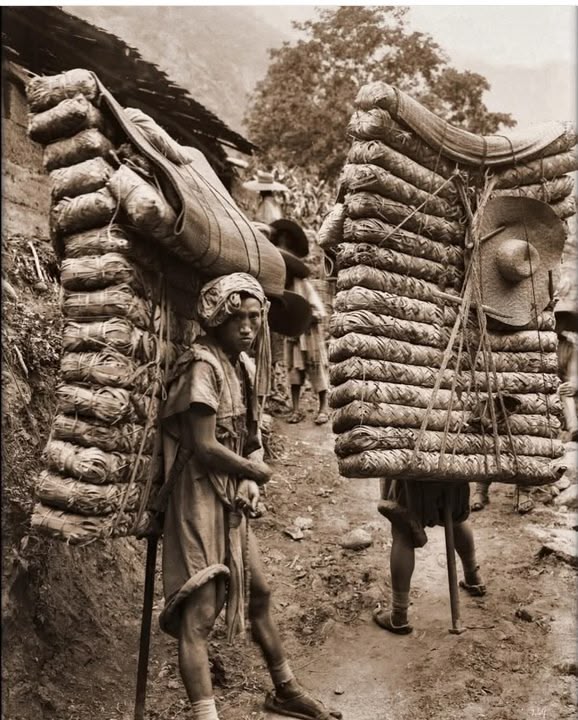 These porters, often referred to as human beasts of burden, carried massive loads that could weigh up to 100 kilograms (over 220 pounds). With wooden racks strapped to their backs and bodies bent under the strain, they marched tirelessly through remote, mountainous terrain, ascending and descending narrow trails carved into cliffsides. The path stretched across altitudes exceeding 5,000 feet, with muddy, crumbling roads that turned dangerous with each passing rainstorm.