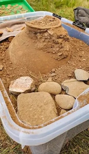 Remembering an episode of the TV programme Time Team, when they discovered the larger hoard, they carefully excavated the pot, before wrapping it in bandages and reporting both hoards to Dr Susie White, Finds Officer for the Portable Antiquities Scheme in Wales (PAS Cymru) based at Wrexham County Borough Museum & Archives.