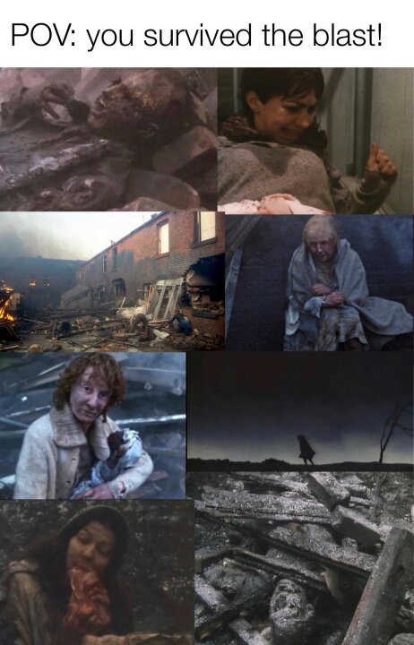 A much gentler but still chilling work of speculative fiction with a credible story line, is Raymond Briggs' When The Wind Blows . The author who gave us the children's Christmas The Snowman, here relates an elderly couple who emerge too early from their improvised blast shelter inside their house, into a bewildering world still and silent save for the wind, and covered in radioactive dust.... I have not read it, but have heard it dramatised very effectively on BBC Radio.