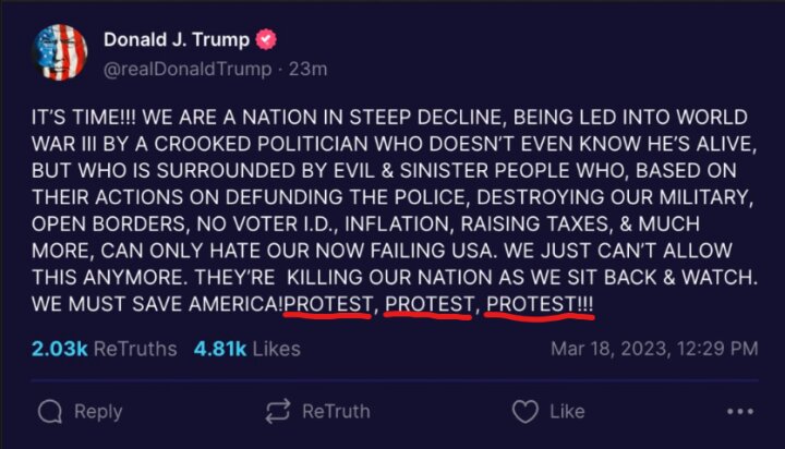 “Protest, take our nation back!” the former president and 2024 GOP presidential candidate declared on his social media platform Truth Social, after pointing to news reports about the possibility he could be arrested Tuesday or soon thereafter.