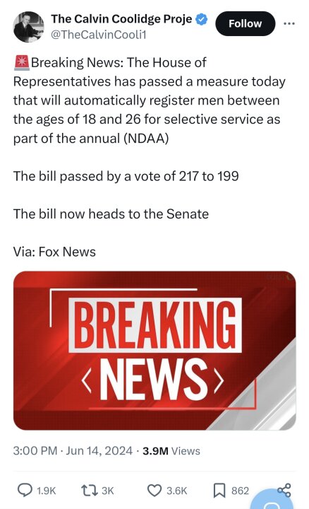 I am shocked that the House has re-instituted the draft. I doubt VERY much that the motion will pass in the Senate, because our Senators are all globalist sell outs who WANT to see China win.