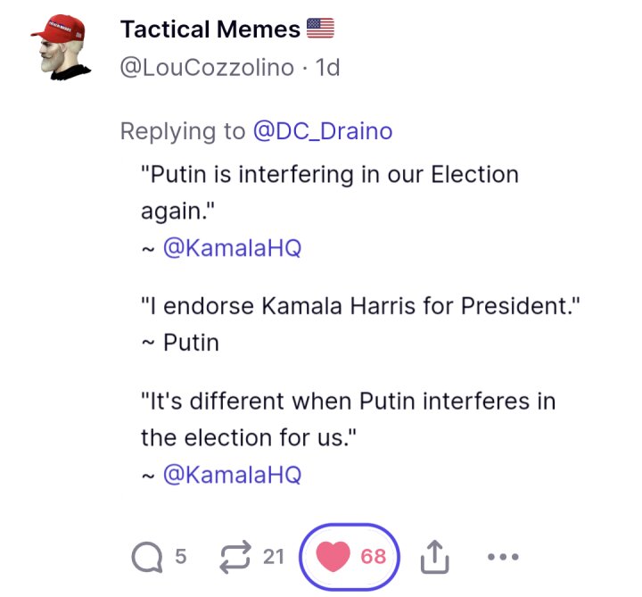 Taking a page from Naploean's playbook, Putin isn't about to interrupt the enemy in the process of destroying itself. Putin was also on record backing Biden prior to Joe's departure from the race. He said Biden is predictable. And Kamala is just more of the same.