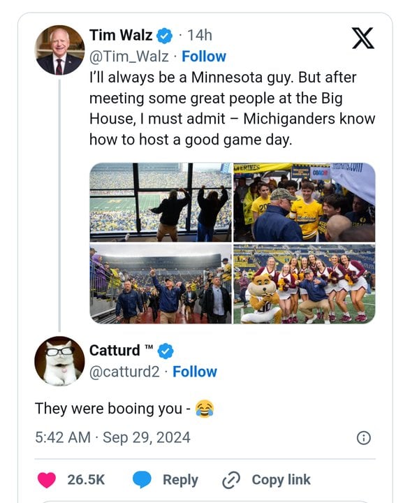 While Trump received multiple standing ovations from the crowd of 101,000+ at the Alabama v Georgia football game on Saturday, Timmy Tampons was booed and heckled in Ann Arbor, Michigan (a blue state) at the Michigan v Minnesota football game.