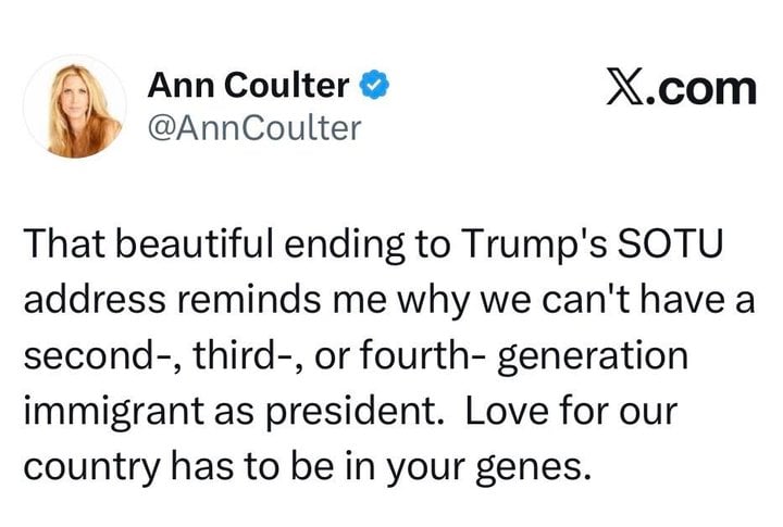 She lost me when she used the world “beautiful” with Trump’s speech. There was nothing beautiful about that speech – it was full of lies and a bit of red meat to brew a bit of hatred between parties. Ann is wrong about love of country being a genetic Trait. A two-year old immigrant monkey could love it’s country and do a better job of running it – than Trump. Cheers!