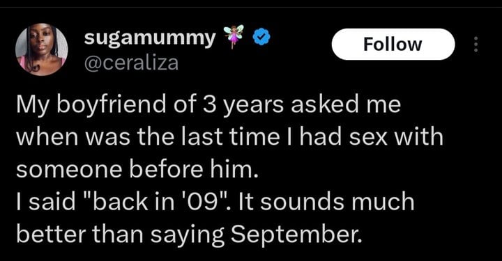 well that time i was in college and in a new years party had sex with a friend of benefit he asked me the same way at around 2am while we were doing that , I confidently said a year ago as I did at 31st evening few hour earlier with another one 😛