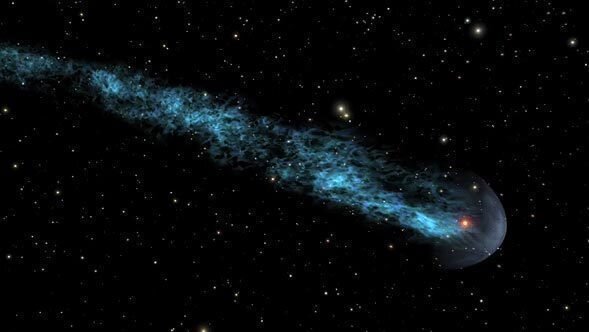 https://earthsky.org/brightest-stars/mira-quite-wonderful/In 2006, the Galaxy Evolution Explorer telescope obtained ultraviolet images of Mira that surprised scientists. They revealed a long comet-like tail of material trailing the star as it sped through ambient galactic gas. Mira moves through this space at about 290,000 miles per hour (130 km/s). The tail, about 13 light-years long, is composed of gases and dust released by Mira over the last 30,000 years. The amount of gases and dust in Mira’s tail equal about 3,000 times the Earth’s mass.