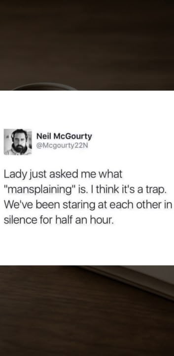 @Monalisasmith86 when a man explains a topic to a woman who already knows the answer or is an expert on it, usually in a condescending way that assumes she has no knowledge.