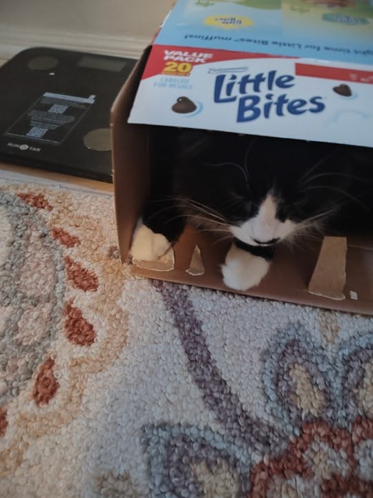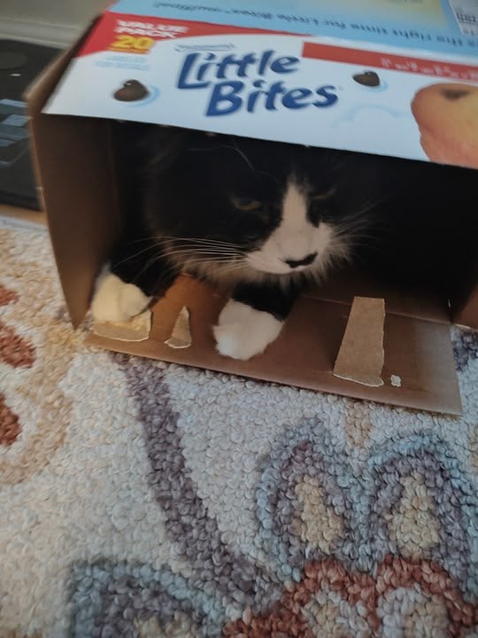 Mine has an empty filing box standing up on end and he sits in it like he is in an elevator.