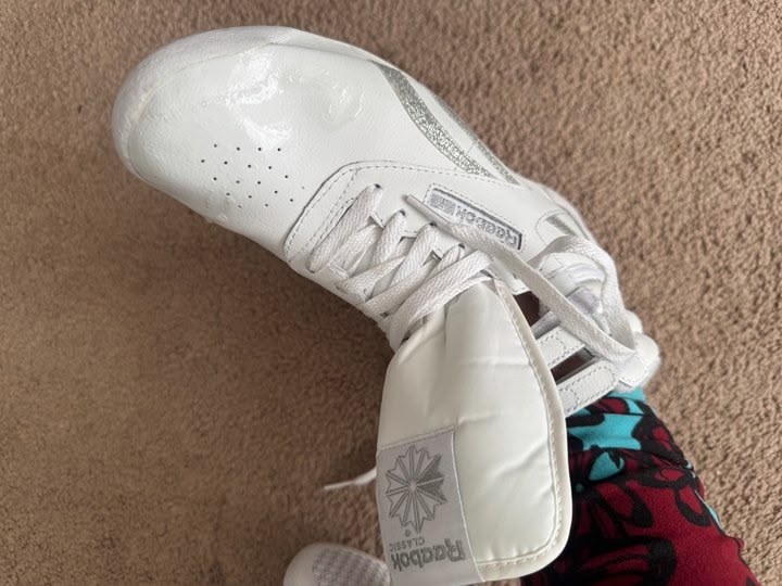 She teased me for a couple minutes before sliding the toe of one of her soft delicious new Reeboks under the gate. Alicia asked me if it was yummy as I sniffed and licked it voraciously:
