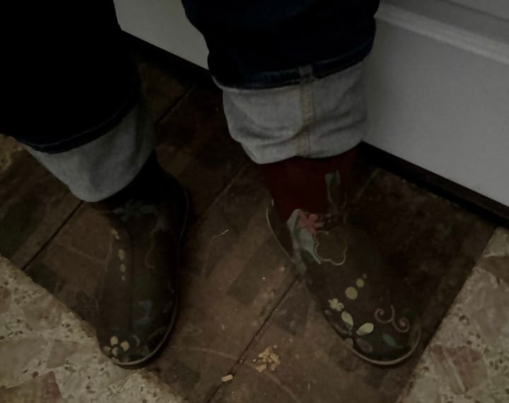 OLD MUDDY BOOTS???! But I wanted her Reeboks! Well, that was it for me. I trotted into the kitchen and layed on the cool floor. Pretty soon I was off in slobbery Reebok dreamland. Well, all of a sudden my nose and sneaker fetish started going crazy and my eyes immediately opened to this: