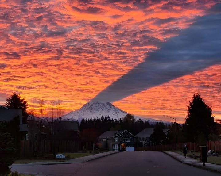 The phenomenon occurs when the sun rises behind the mountain, causing its shadow to project onto the cloud deck, creating a dramatic visual effect. The event is rare and happens mid-October to January when the sun's position aligns perfectly with Rainier's peak, AND it's a clear day (which makes it even really rare, given our weather).