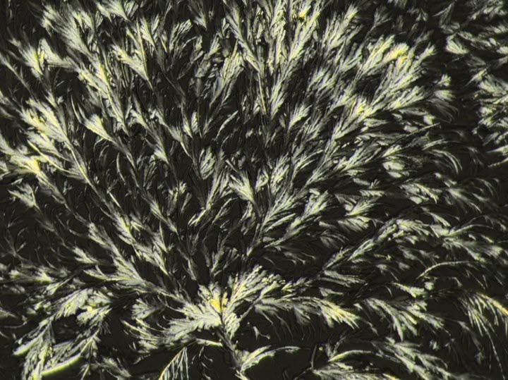 Vitamin C dissolves easily in water. This is a thin layer of vitamin C water solution dried on a microscope slide. When the water evaporates, it forms tiny crystals of vitamin C.