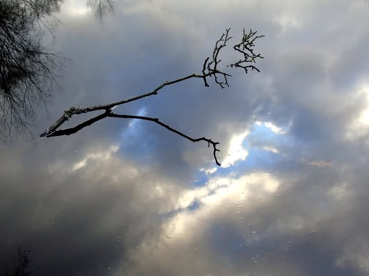 it's a branch immersed in calm water that is reflecting the sky is my guess