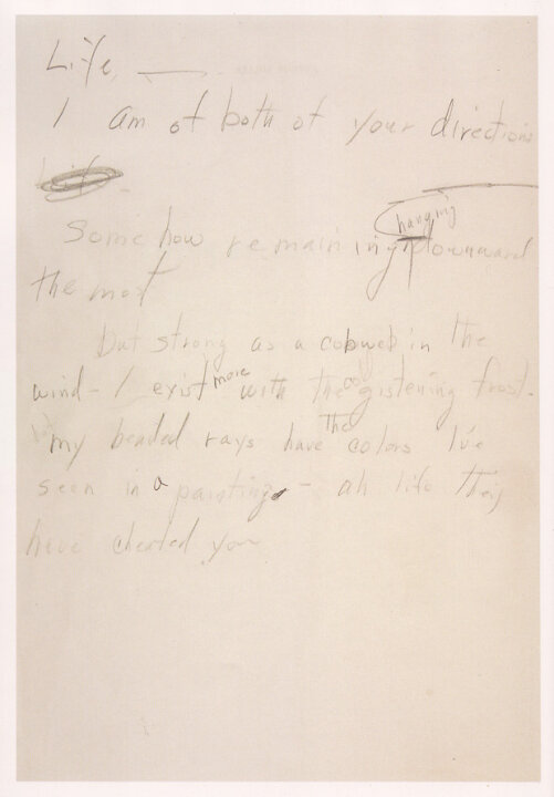 Life — I am of both of your directions Somehow remaining hanging downward but strong as a cobweb in the wind — I exist more with the cold glistening frost. But my beaded rays have the colors I’ve seen in paintings — ah life they have cheated you.