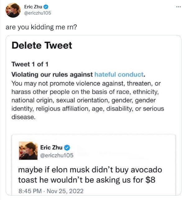 Now that some goofy libertarian bought Twitter and is letting a lot of undesirables on, now you care about this? Am I getting the timing correct?