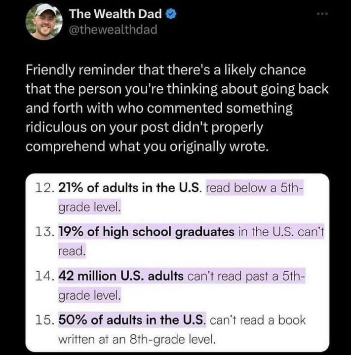 But a large majority of Americans can't read beyond elementary school level. The person you are arguing with about trump probably cannot comprehend your comments because they are unable to.