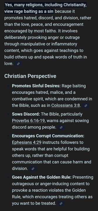 Is rage baiting a sin? Is the act of intentionally saying things that give people negative emotions, and spark negative reactions a bad thing to do in the eyes of the lord? Intentional provocation, sowing discord? Post Comment Receive notifications Add a comment...