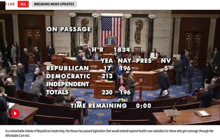 “In a remarkable rebuke of Republican leadership, the House passed legislation Thursday, 230-196, that would extend expired health care subsidies for those who get coverage through the Affordable Care Act as renegade GOP lawmakers joined essentially all Democrats in voting for the measure.