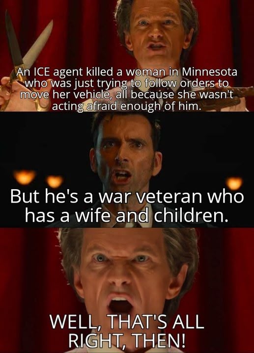 And on a personal note I don't find being an ICE officer a respectable career path in any way. Doesn't matter in this situation. All that matters is went down. And we SAW what went down. If he walks it's a shot across the bow with a message for Americans. "OBEY or die." That's not who we are. That's not who anyone should be.