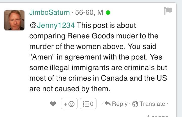 @Jenny1234 This post is about comparing Renee Goods muder to the murder of the women above. You said "Amen" in agreement with the post. Yes some illegal immigrants are criminals but most of the crimes in Canada and the US are not caused by them.