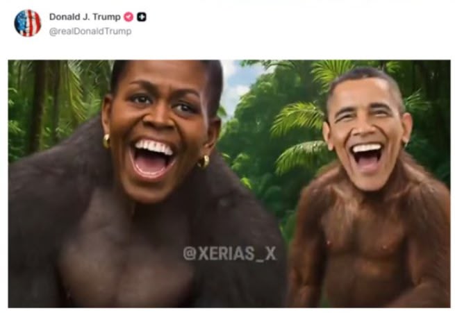 White House Defends AI Video Of Obamas As Apes Posted On Donald Trump’s Truth Social Account - IMDb https://share.google/K0mHcXv0dtMRiOMhY