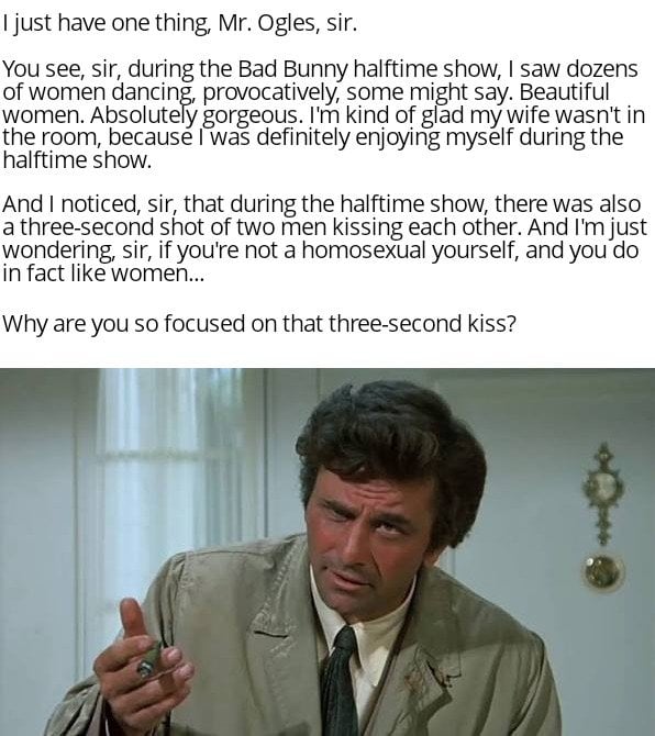 Did I watch a different halftime show than you did, Andy? Because this is the one I saw: [media=https://youtu.be/G6FuWd4wNd8] The only thing I saw that might be considered explicitly gay was a three-second kiss that you'd be forgiven for missing amid all the festivities. So I'm bringing in a special investigator to ask the hard questions of Mr. Ogles: