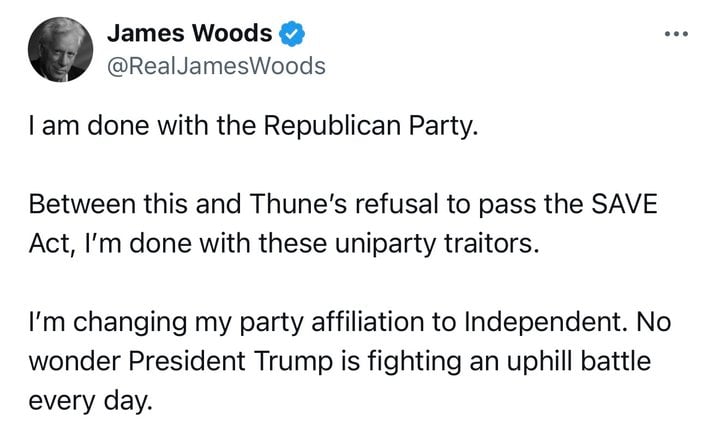 ‘I am done with the Republican Party,’ Woods wrote. ‘Between this and Thune’s refusal to pass the SAVE Act, I’m done with these uniparty traitors.'