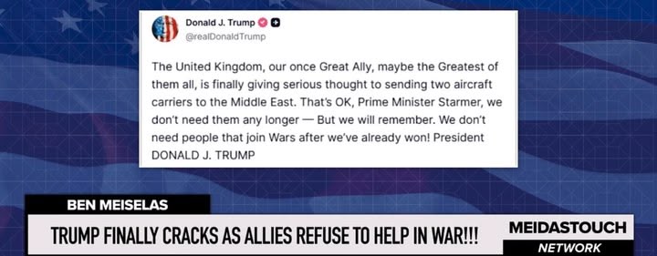 MeidasTouch host Ben Meiselas reports on Donald Trump finally cracking under pressure over his war in Iran as he begs the former allies of the United States to help out in the Strait of Hormuz and as his FCC threatens news networks who do not report on Trump’s fabricated messages on the war.