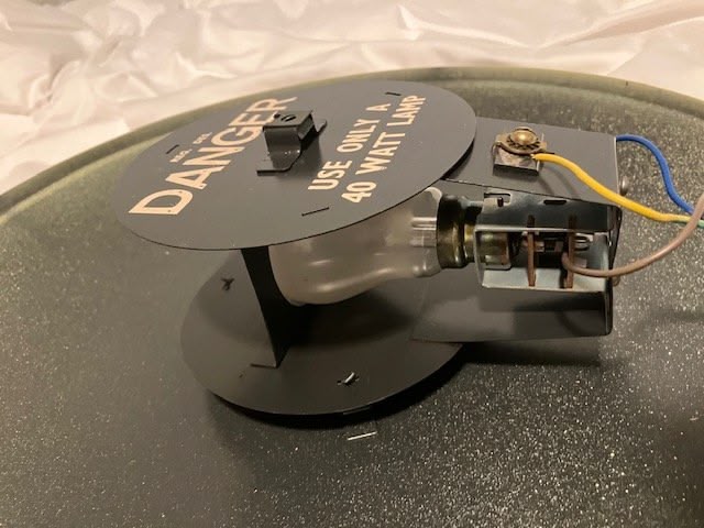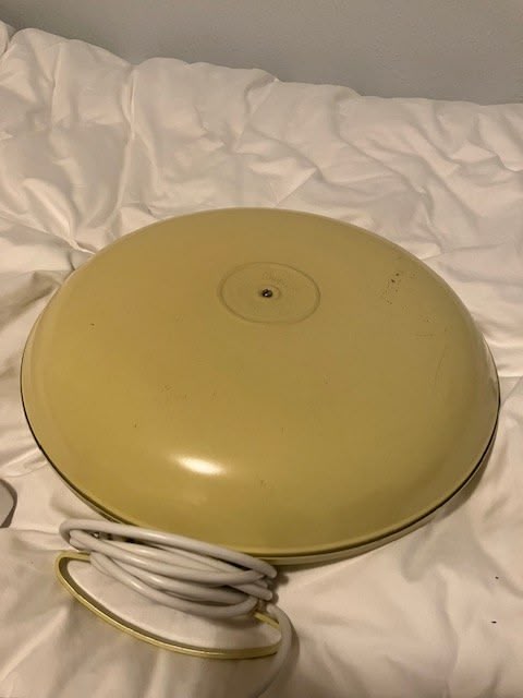 It couldn't very well not work; all it is is a 40 watt tungsten bulb inside a 'flying saucer' pressed steel case painted in a peculiar limeflower colour. It's an old family possession. (I put a new cable on it btw...)
