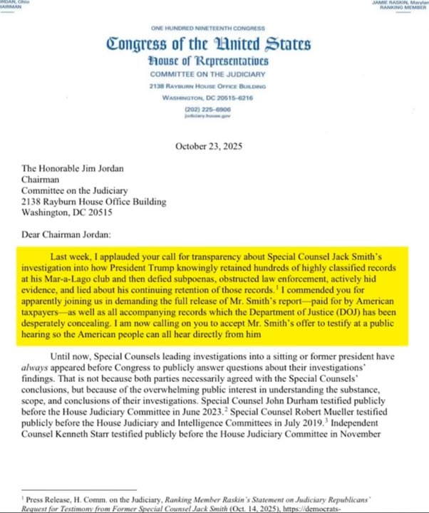 Jamie Ruskin, Ranking Member of the Judiciary Committee, sent Gym Jordan this letter…