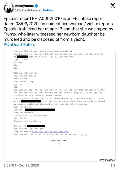 The account for Anonymous even weighed in, writing, "Epstein record EFTA00025010 is an FBI intake report dated 08/03/2020, an unidentified woman / victim reports Epstein trafficked her at age 13 and that she was raped by Trump, who later witnessed her newborn daughter be murdered and be disposed of from a yacht."”