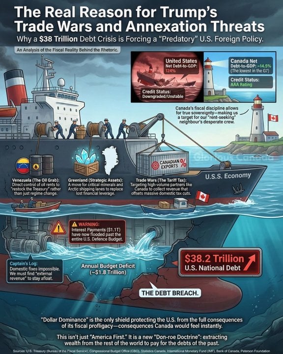 - Trade Extraction: Because Canada is a high-volume trade partner with manageable debt, the U.S. views Canadian exports as a lucrative "tax base" that can be tapped through aggressive tariffs to offset its own domestic shortfall (U.S. Department of Commerce).