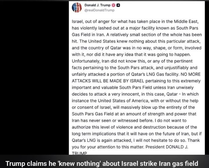 Oil may not be flowing, but Trump & Netanyahu LIES sure are! [media=https://www.youtube.com/watch?v=H5dTcE9YZww]Donald Trump has claimed he had heard “nothing” from Netanyahu about Israel’s strike on a major gas facility in Iran, a sign of unusual strain in the long-standing U.S.–Israel alliance. Post Comment Receive notifications Add a comment...