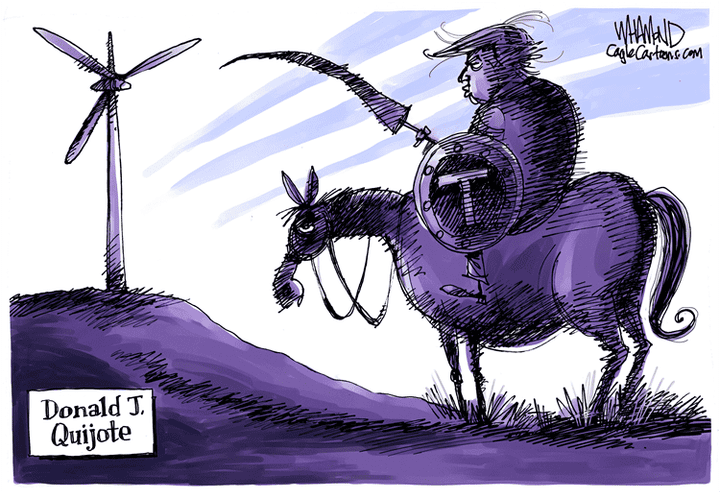 We don't build windmills either. We build wind-turbine powered alternators instead. Many of 'em! I'd not sure if he'd grasp that.