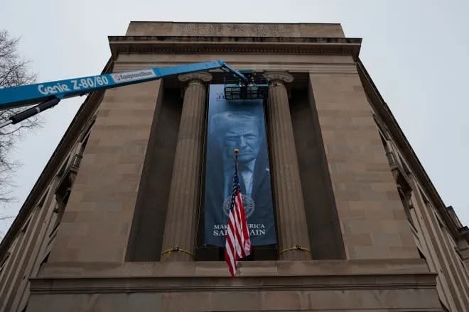 In other news, a banner of U.S. President Donald Trump is hung on the Department of Justice on February 19, 2026 in Washington, DC. The banner reads "Make America Safe Again." Heather Diehl, Getty Images