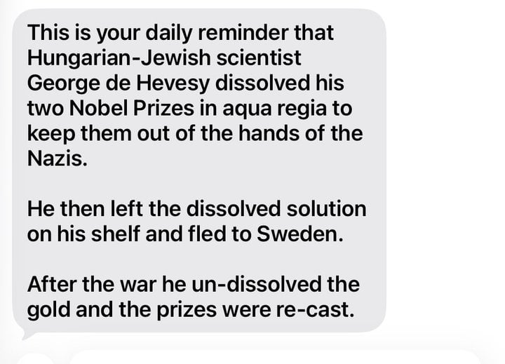 After the war, de Hevesy retrieved the solution, precipitated the gold, and sent it to the Nobel Foundation, which recast the medals for the original winners.