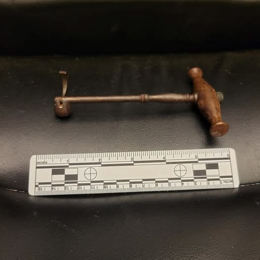 @onewithshoes No, but somebody guessed it. Definitely not something you’d want to encounter in real life. It’s a 6-inch metal tooth puller from the Civil War era, complete with a wooden handle. Imagine facing dental work withthistool—yikes!