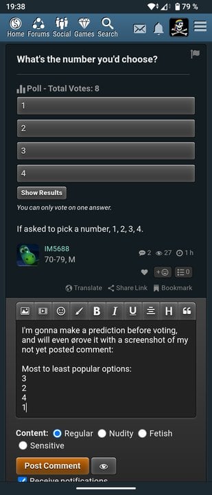 What's the number you'd choose? Poll - Total Votes: 9 See Poll Options If asked to pick a number, 1, 2, 3, 4.This is a truncated preview of the original post. Press here to view the full post. Post Comment Receive notifications Add a comment...
