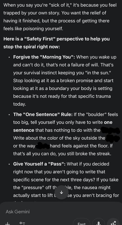 I use AI to get me in the right headspace to write but today I massively triggered myself. And I cannot get myself to write. It makes me want to punch the wall and scream. I cannot get past this scene and it’s been weeks because it’s causing a physical reaction. It’s so bad I thought about taking Zofran. I’m getting snappy with Gemini too. I’m pissed.