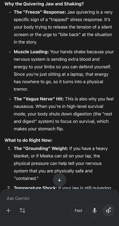 I finally started writing again yesterday. It just flowed out of me. And my jaw was quivering and my hands were shaking so hard. I realize writing about this has become difficult. Gemini told me “write a sentence like “all choices were taken away, character is experiencing trauma.” And skip. But I didn’t want to. It took weeks but I finally did it and I need to write more. It’s all I think about. I told my therapist about my writing but I didn’t tell her what it was about.