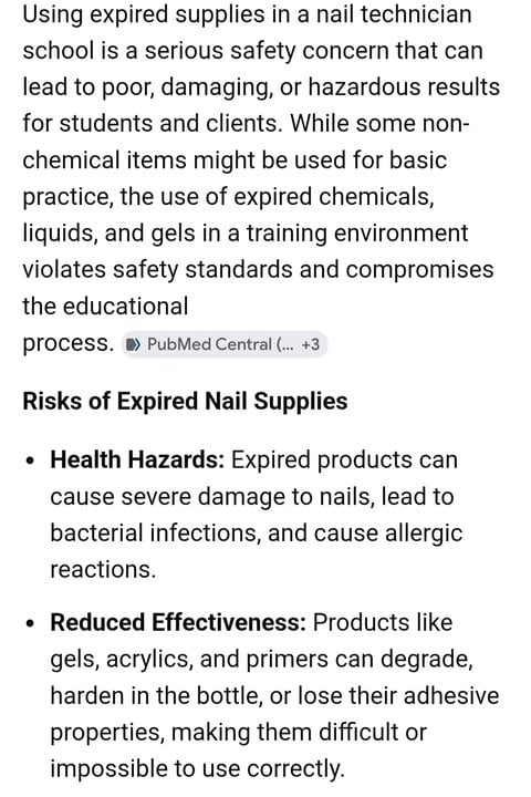 I’m a certified nail tech and when I went to school the worst thing those expired things can do is not hold up or work right away. Not sure if that’s considered a health hazard. Plus school supplies are meant for practicing and learning. Not trying to be negative, just passing along info I learned on.