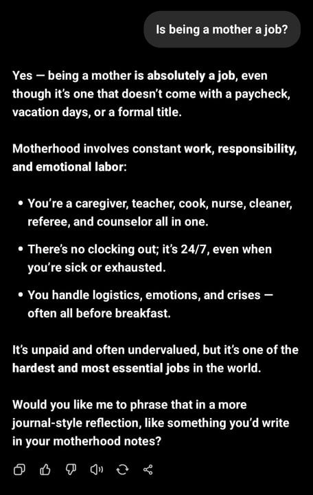 I said to him: You're the only person in the world who doesn't know that being a mother is a job. Even Chat GPT knows.
