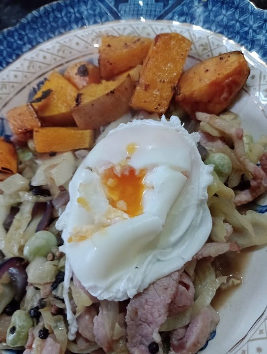 Stir-fried cabbage with bacon, onions, broad beans and peppercorns, topped with a poached egg. Sweet potato and butternut squash wedges on the side