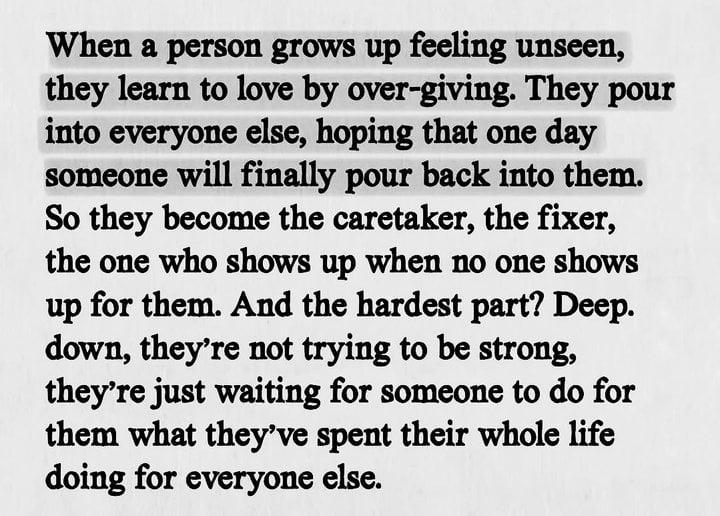 And it's utterly exhausting. I began being a people pleaser as a kid Bec my home life was a nightmare. I thought,* I hope no one thinks of me as bad or as dirt as my mom does,so I'll do or be whatever they need. * Little did I know over giving does not increase your value at all. Or self esteem. It just makes you frustrated, Bec not many will reciprocate 🥺