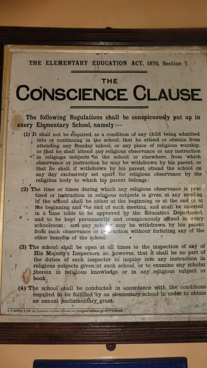 This poster was placed in every school in England in 1870. It bans compulsory religious education (RE). I hope you can make out the print.