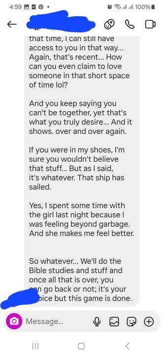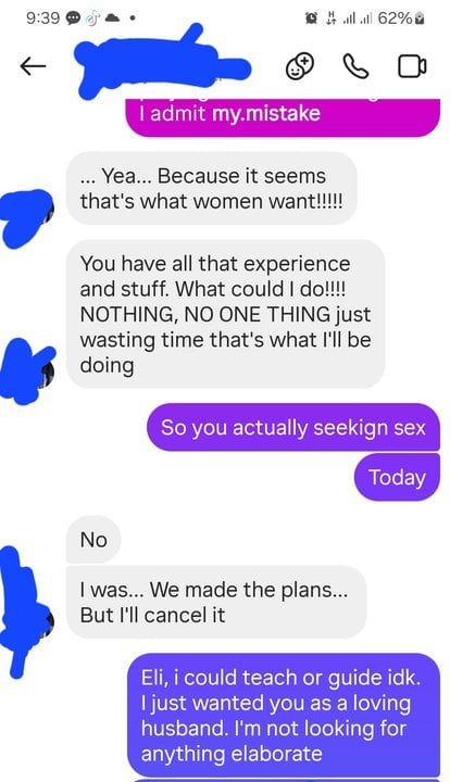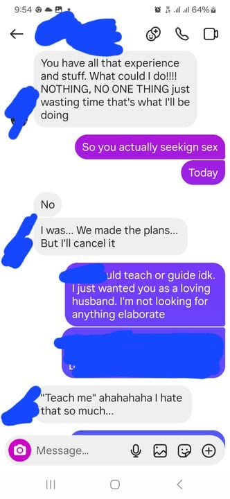 I made a previous post about a guy who studies the Torah, age 33 soon and a virgin. It's an online relationship, never met him yet. I told him my experiences with two people and it made me cry. Now fast forward, we still talking but yesterday morning after a night of me saying, i still "sometimes wish i could go back to my ex because he wouldn't ask me these questions cause it would be pure," he lost it. I told him the morning our last interaction was in January sexually and he left. I deactivated my instagram cause that's how we communicate. He reached out on my number 2 hrs after asking me to return to Instagram, i did. He then said he wants to be friends snd wants to do bible study cause it will help me get over my ex so I can be free for my future husband. I agreed.